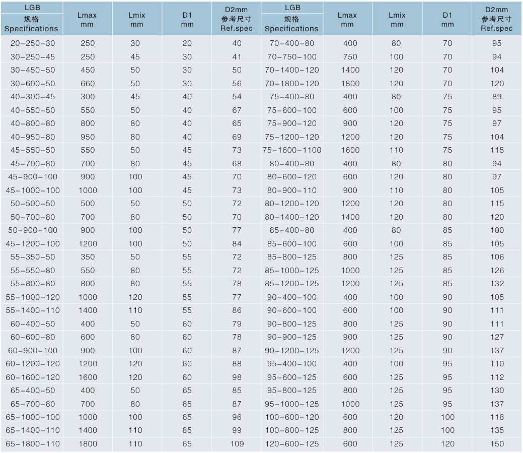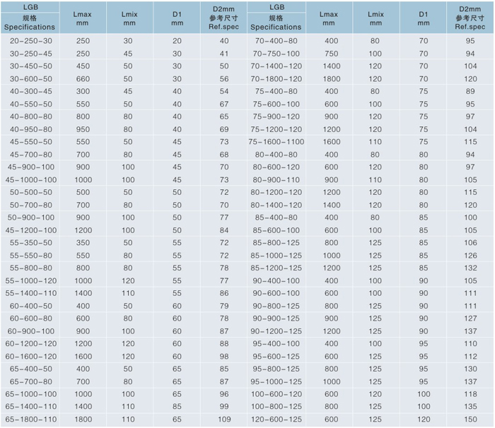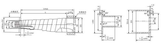 D1-保護(hù)套小端內(nèi)徑=dmaz+10毫米 D2-保護(hù)套大端內(nèi)徑 D3-大端法蘭內(nèi)徑=D2+6~8毫米 D4-小端法蘭外徑=D1-1~2毫米 dmax-被保護(hù)零件的較大直徑 Lmin-較小壓縮長度 Lmax-較大延伸長度 L-較大允許行程